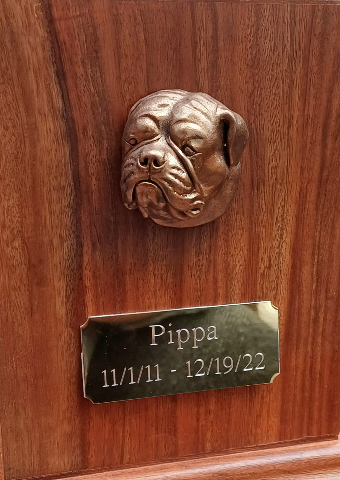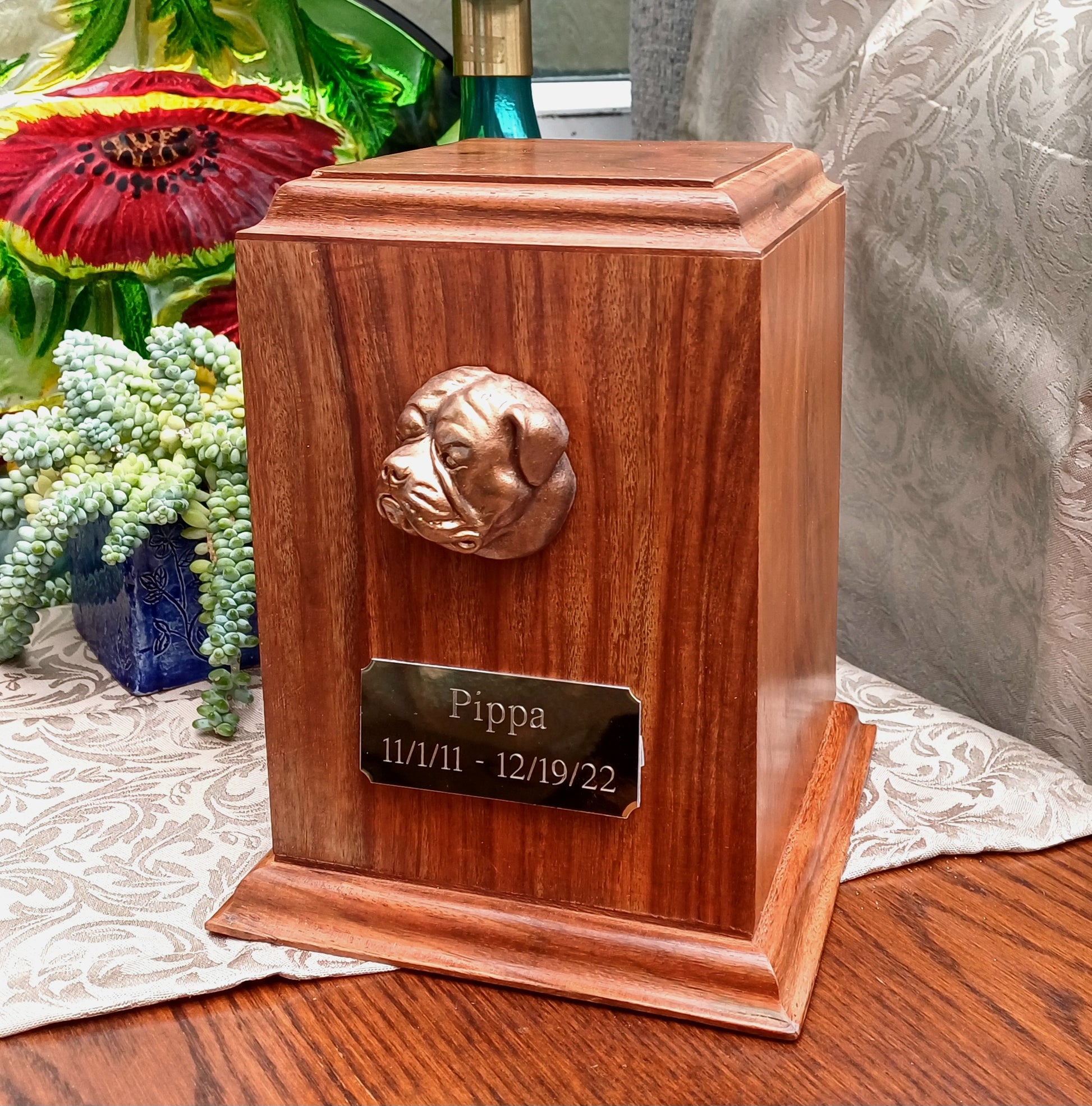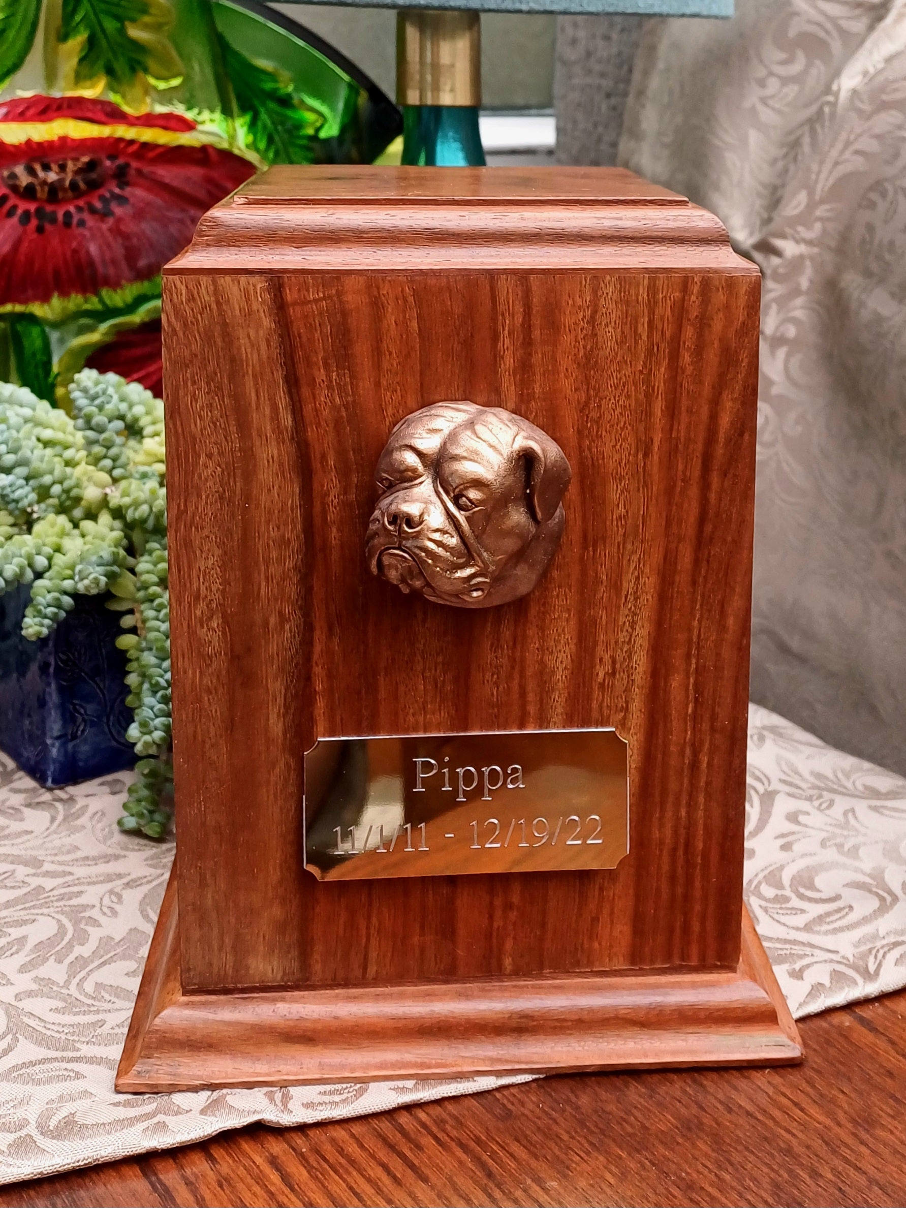 Honor your beloved American bulldog with our handcrafted wooden cremation urn. Made specifically to hold the ashes of your precious pet, this urn is a beautiful tribute to their life. Keep their memory alive with this unique and meaningful resting place.